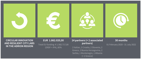 The Institute AEIPLOUS is a partner in the project “Circular Innovation and Resilient City Labs in the Adrion Region (CIRCLE)”, INTERREG V-B Adriatic-Ionian ADRION Programme 2014-2020. Project Partners: Municipality of Forlì, Italy (Coordinator), Romagna Tech (Italy), School Center Velenje (Slovenia), RDA of Northern Primorska Ltd. Nova Gorica (Slovenia), Regional development agency Međimurje REDEA Ltd. (Croatia), Energo-data (Croatia), Anatoliki S.A Development Agency of Eastern Thessaloniki's Local Authorities (Greece), Institute for Innovation & Sustainable Development- AEIPLOUS (Greece), Environmental Protection and Energy Efficiency Fund of the Republic of Srpska (Bosnia – Herzegovina), Municipality of Laktasi (Bosnia – Herzegovina), Faculty of Applied Ecology - Futura (Serbia), Regional Agency for Socio – Economic Development – Banat Ltd (Serbia), Municipality of Ulcinj (Montenegro), Municipality of Tirana (Albania). Duration: 1/2/2020 – 31/7/2022,